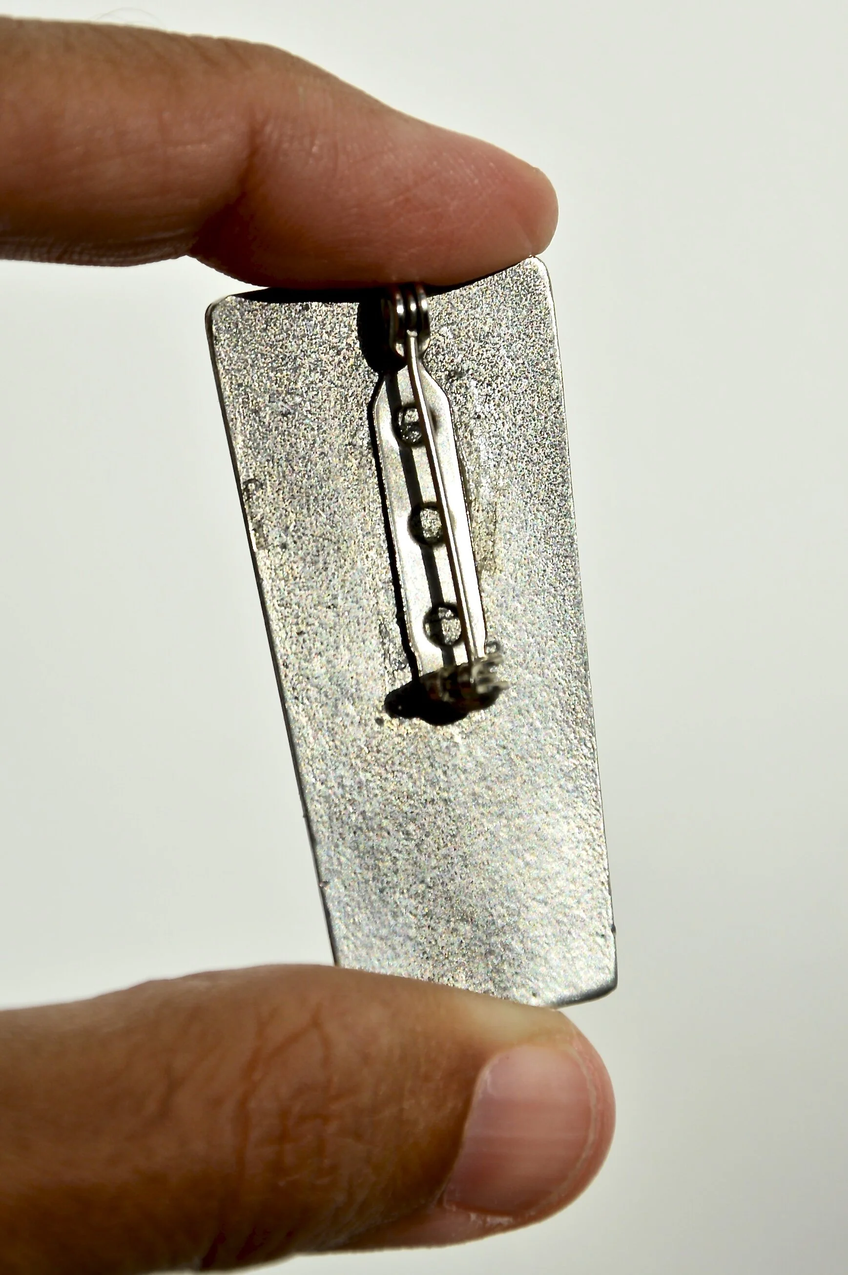 Rectangular pin showing a warrior or hunter atop a horse, pursuing an Irish deer or elk, along with a wolfhound. This could be a depiction of Finn McCool and his dog, Bran.