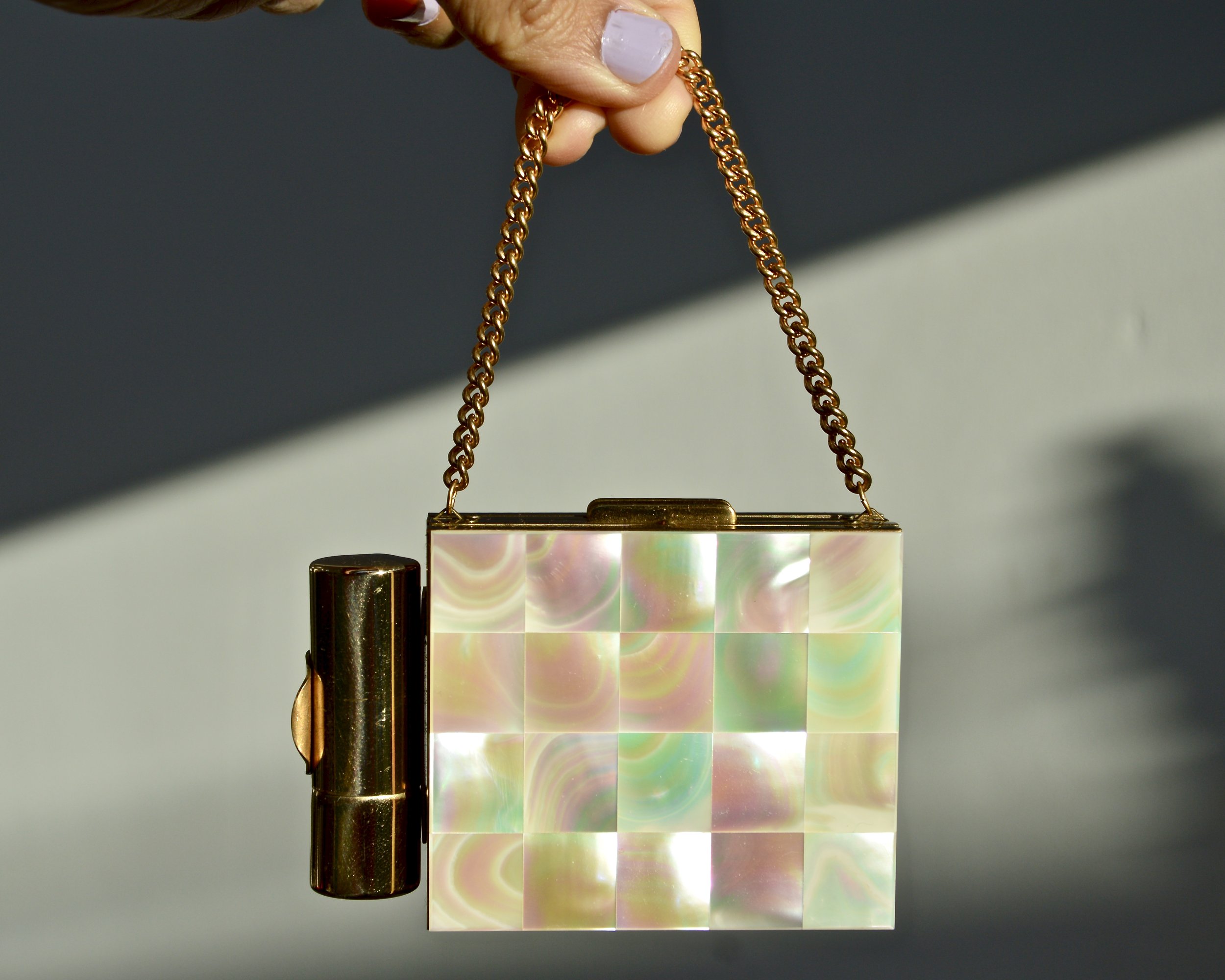 1950s goldtone, two-compartment ‘carryall’ compact with mother of pearl mosaic facade and lipstick holder. Ideal bridal accessory.