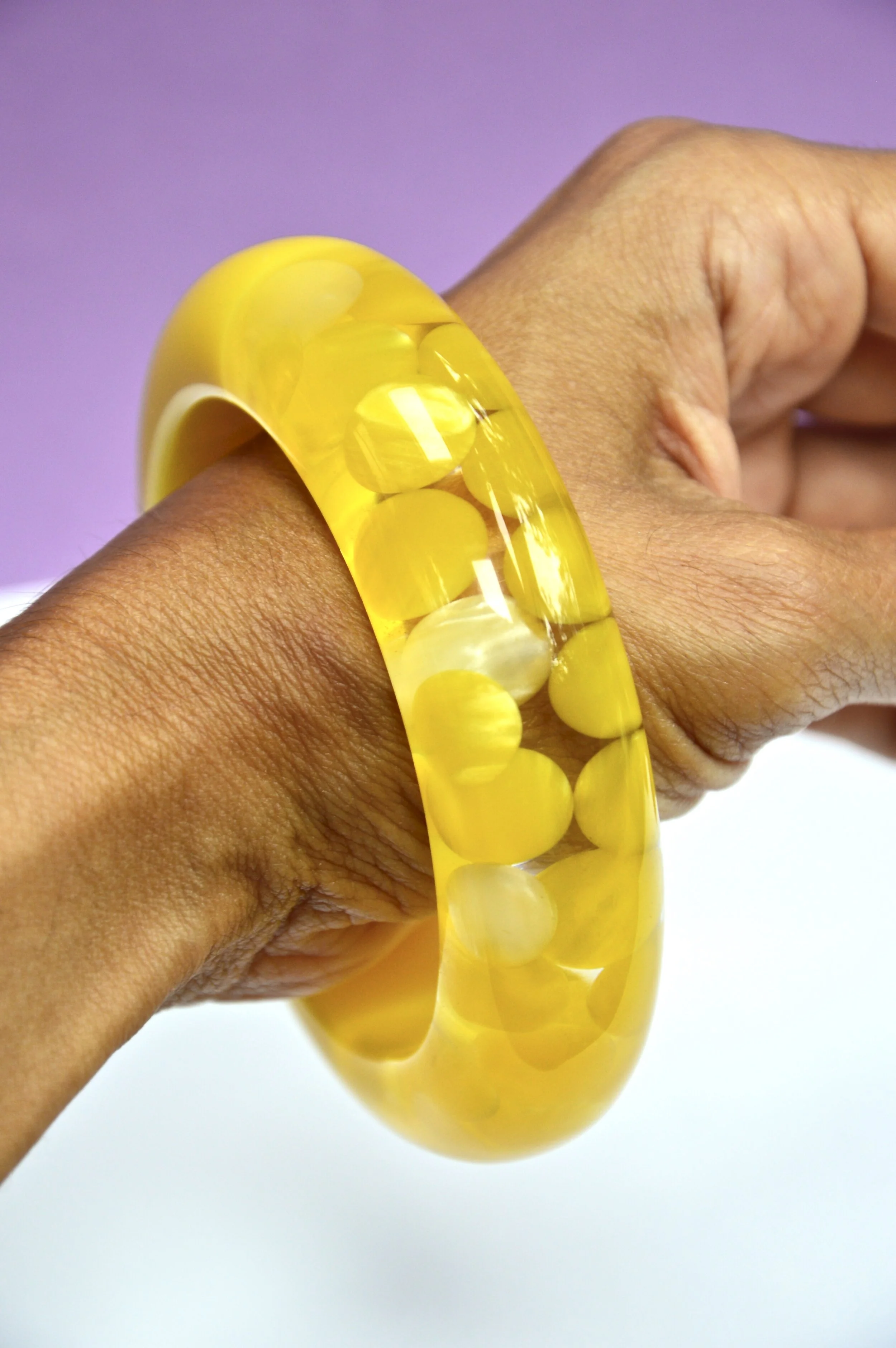 Chunky, domed bangle half solid, super-bright yellow, and half clear lucite with suspended, iridescent yellow and white dots or pills.