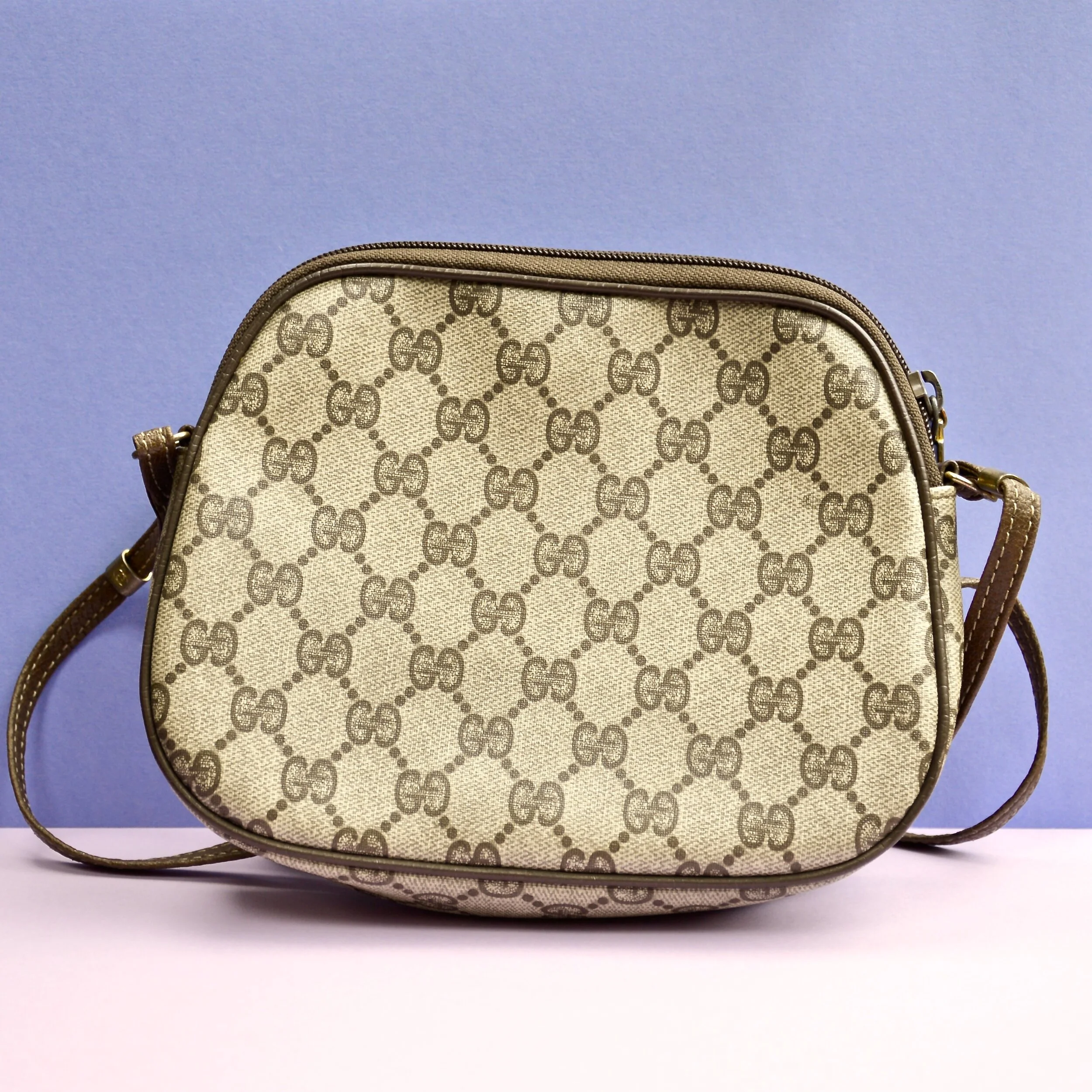 1970s Gucci monogram canvas cross body purse with leather lining. Italy.